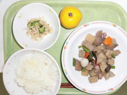 今日の献立は、牛乳、ごはん、鶏肉と里芋のうま煮、きゅうりともやしのごま風味、みかんです。
