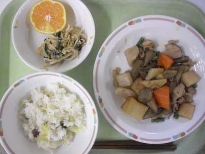 10月13日の給食は、牛乳、ごはん、がめ煮、もやしのごま風味、菊花みかんです。