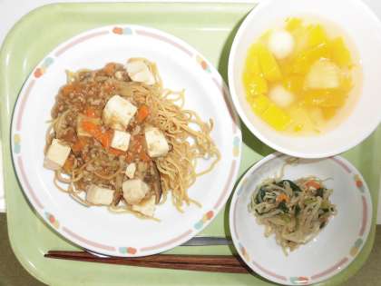 10月14日の給食は、牛乳、麻婆豆腐焼きそば、ナムル、フルーツ白玉です。