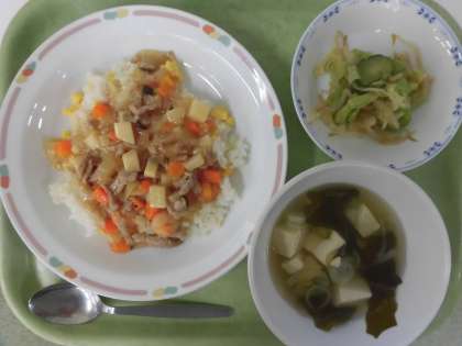 今日の献立は、牛乳、あんかけチャーハン、中華サラダ、わかめスープです。