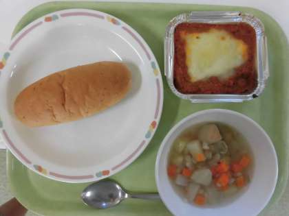 今日の献立は、牛乳、セサミパン、シェパーズパイ、スコッチブロスです。