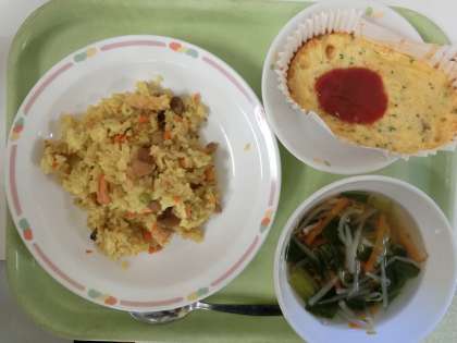 10月26日の献立は、牛乳、洋風炊き込みご飯、スペイン風オムレツ、もやしスープです。