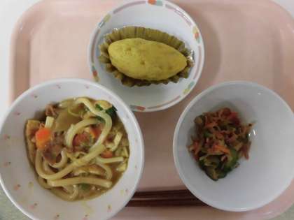 今日の献立は、牛乳、カレーうどん、かみかみサラダ、スイートポテトです。