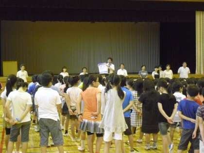 7月5日(月)に児童朝会が行われました。「休み時間のあと、一輪車が校庭に残されているのに気づいたら・・・」「下駄箱から友だちの上履きが落ちているのを見つけたら・・・」という身近な話題をもとに、校長先生から「良心」についての話がありました。