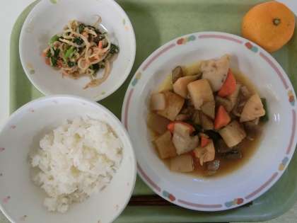 今日の献立は、牛乳、ごはん、筑前煮、野菜のごまみそかけ、みかんです。