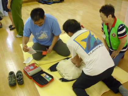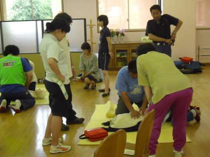 7月6日(火)に救急蘇生法講習会が行われました。玉川消防署の署員の方から心臓マッサージ、AED(自動体外式除細動器)の使い方などを教えていただきました。
