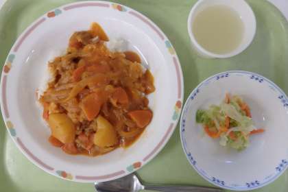 今日の献立は、牛乳、ハッシュドポークライス、キャベツサラダ、りんごゼリーです。
