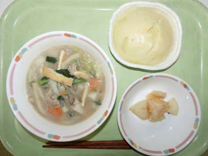 今日の献立は、牛乳、みそ煮込みうどん、大根の中華味、りんご入り蒸しパンです。