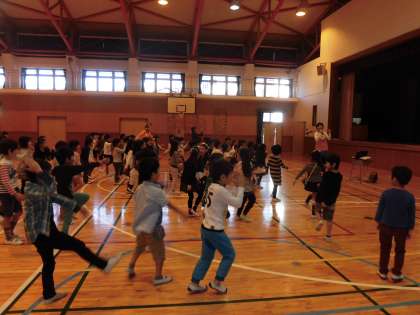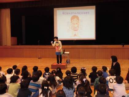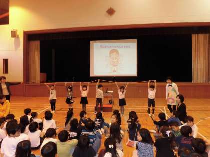 18日。1年生の子どもたちが食育の出前授業を受けました。日本成人病予防協会の方たちから、黄・赤・緑(炭水化物・たんぱく質・ビタミン、ミネラル)の食べ物が体を作っていること、特に朝ごはんの大切さを教えていただきました。体が寝ている間も、脳は休んでいないので、脳のスイッチを入れるためにも、朝はしっかり炭水化物をとることに子どもたちもうなずいていました。また、元気に朝から活動するためにも体温を上げるたんぱく質が必要です。お話を聞いた後は、バナナうんちが出るおまじないやダンスで楽しみました。トイレに行く子を、決してからかわないことも約束しました。