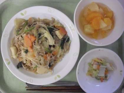 今日の献立は、牛乳、五目あんかけそば、ラーパーツアイ、フルールポンチです。