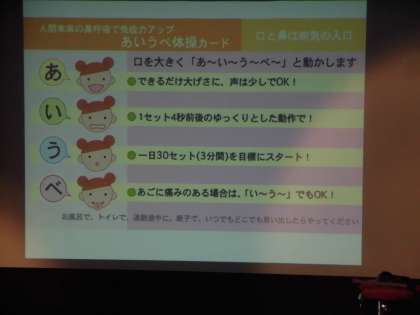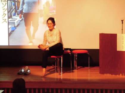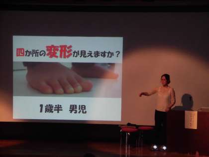 口は消化器であって呼吸器ではないこと、口呼吸は万病の原因にもなることをはじめ、すぐできる、あいうべ体操、ひろのば体操、マッサージ方法を紹介していただきました。高這いや手押し車など幼稚園や小学校でも取り入れられる活動も教えていただ、さっそく幼稚園の先生とも情報共有しました。実際に大畠先生に足を診てもらう時間もあり、大いに盛り上がりました。