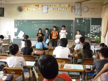 7月17日、5年生は温暖化防止に向けて、CO2削減に取り組んでいます。どのようなことでCO2が発生するのかを調べ、学校で全校のみんなに呼びかけました。また、夏休みに入る前に、各家庭で自分が取り組むCO2削減目標を発表しました。