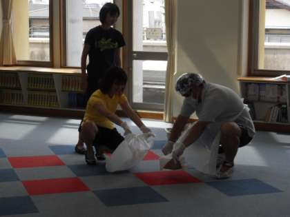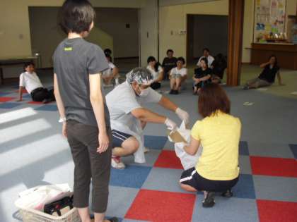 7月20日(火)に「緊急時対応訓練」がありました。急病人やケガ人が出た場合の対応方法を、実技を交えて行いました。直接触れてはいけないものの処理のために、全身をビニルでカバーして訓練しているところです。