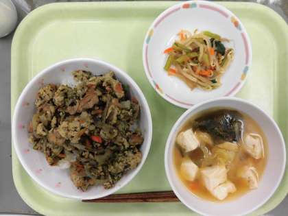 今日の献立は、牛乳、親子丼、煮びたし、みそ汁です。