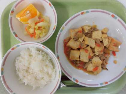 今日の献立は、牛乳、ごはん、家常豆腐、ラーパーツアイ、スイートスプリングです。