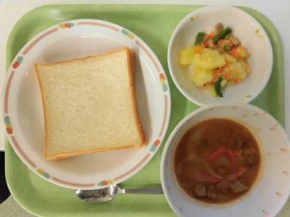 今日の献立は、牛乳、ジャムサンド、ポークシチュー、リエージュ風サラダです。