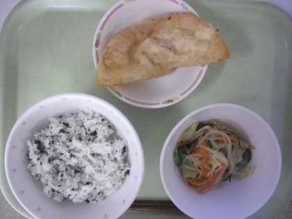 今日の献立は、牛乳、わかめごはん、ジャンボギョウザ、春雨サラダです。