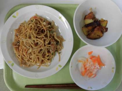 今日の献立は、牛乳、塩焼きそば、大根の甘酢かけ、りんご入り大学芋です。