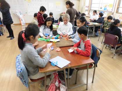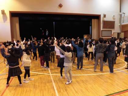自己紹介といろいろな言葉でのあいさつをした後、中町小学校を案内します。「校長室」を英語で伝えようと苦戦していました。教室に戻ってからは、中町の子どもたちが折り紙を教えます。つるや花を折り紙で作ることができ、清泉の子がとても喜んでいました。日本文化を知ってもらった後は、体育館で全員でダンスを楽しみました。ロシアやメキシコのフォークダンスを一緒に踊る中で、身近に多様な世界を感じ国際交流を楽しんだ子どもたちです。