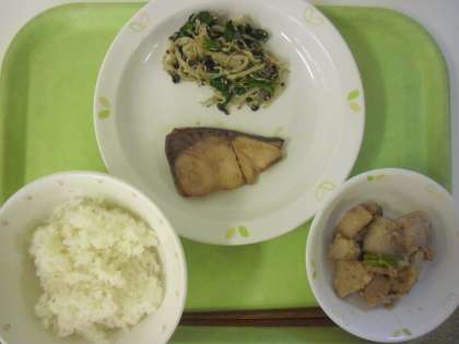 今日の献立は、牛乳、ごはん、ぶりの照り焼き、ほうれんそうの乾物和え、里芋の甘辛煮です。