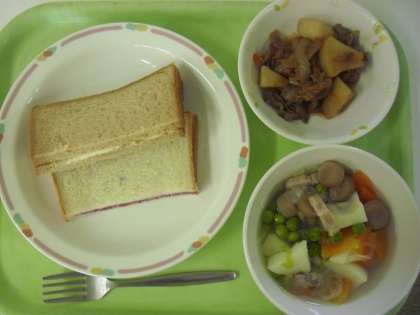 今日の献立は、牛乳、二色サンド(クリームチーズ・ブルーベリージャム)、ハッシェ、エルテンスープです。