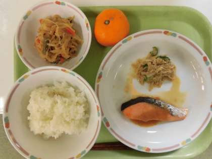 今日の献立は、牛乳、ごはん、鮭のステーキソース、ごま酢かけ、切り干し大根の煮つけ、みかんです。