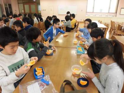 23日。ランチルームが柑橘類のすてきな香りに包まれました。5年生の農業の学習の一環で、JA西宇和の青年農業者の方たちが出前授業を行いました。農家の方が1個1個柑橘に袋掛けをしたり、防除をしたりする動画を見て、改めて、本当に人の手が加わっておいしくいただけることを感じました。愛媛の柑橘34種のうち、不知火、清美、はるか、甘平、デコポン、せとかを食べ比べました。香りもよく、どれもおいしくいただきました。