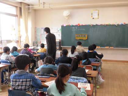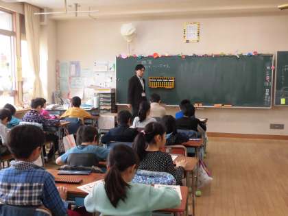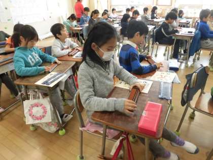 24日。今日と27日の2回にわたって、3年生はそろばん教室の出前授業を受けます。東京珠算教育連盟の方が講師になって教えていただきました。そろばんの玉がはじかれる音が心地よく響く教室でした。