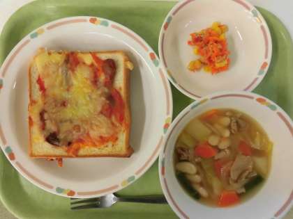 今日の献立は、牛乳、ピザトースト、白いんげんの田舎風スープ、にんじんサラダです。