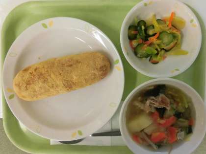 今日の献立は、牛乳、揚げパン、野菜のイタリアンドレッシングかけ、ベーコンと野菜のスープです。