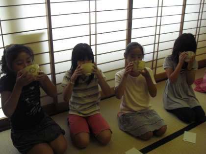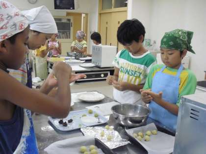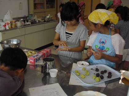 8月20日(金)夏休みふれあい教室「和菓子とお抹茶」がありました。家庭科室で、「焼きまんじゅう」、「芋あん」、「小豆あん」などの和菓子作りをしました。20個以上作ったグループもありました。その後、玉中の和室で、抹茶を点て、和菓子とともにいただきました。自分で点てた抹茶と作った和菓子を口にでき大喜びでした。