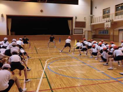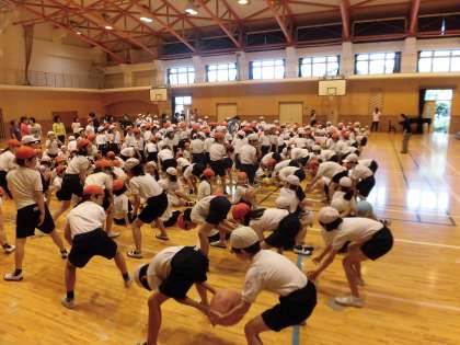 18日。今日の体育朝会は、アスレチックトレーナーの方に来ていただき、全校児童で体づくりの運動を教えていただきました。体全体を使うじゃんけんや背筋を伸ばすボール送りゲームなどいつもとちがう体の部分を使うことに意識できました。