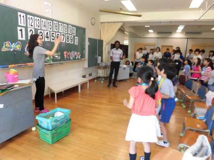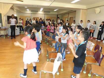19日。5校時に2年2組の教室に区内の先生が大勢来ました。東京都英語教育推進リーダーである佐々木朋子先生がALTの先生と一緒に授業を行う様子を、区内の先生方に見てもらい授業力を高めてもらうのがねらいです。一つの活動時間は短く、とてもテンポ良く進みます。子どもたちも体を使って楽しく英語に親しんでいます。今後も中学年・高学年の教員対象に佐々木先生は模範授業を公開していきます。
