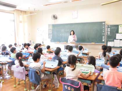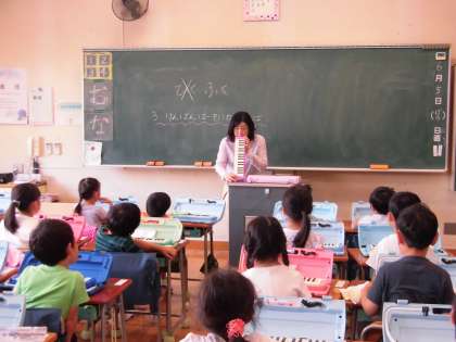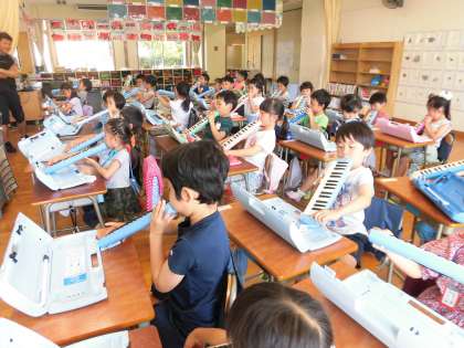 5日。今日は1年生の教室にけんばんハーモニカの先生が教えに来てくれました。