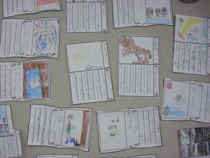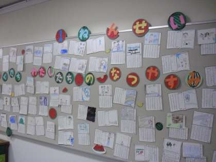 来客・職員玄関の入口に掲示板があります。毎月テーマを決めて掲示しています。9月は1年生の「ぼくたち わたしたちの 夏休み」です。一人ひとりの夏休みの思い出や強く印象に残ったことなどが掲示されています。ぜひご覧ください。