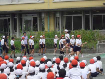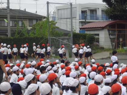 9月9日(木)に「体育朝会」が行われました。各学級で自分たちのめあてを決め、長縄に挑戦しました。6年生の模範演技をみた後、全員元気よく跳ぶことができました。