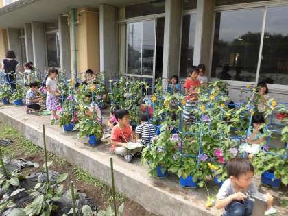 29日。1年生が毎日お世話をしているアサガオが大きく生長しています。つるも伸び、葉も茂り、大きな花がいくつも咲いています。自分の身長よりもつるが伸びたアサガオを得意げに観察カードにかいていました。