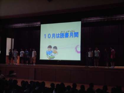 28日。今日の集会では図書委員会の発表が行われました。図書司書さんからのおすすめ本をクイズや読み聞かせで紹介してくれました。10月は読書月間で、地域の方や保護者の方の読み聞かせやぶっくらぼさんの出前授業が行われます。心を充たすエネルギーとなる一冊の本、一文との出会いが楽しみです。