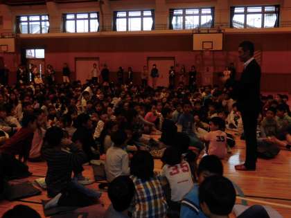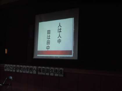1時間目は、全学級で道徳授業の公開をしました。大勢の保護者の方や地域の方に見守られ、友だちと考えを交流しあいました。2時間目は福田訓久先生を迎えて、児童対象の講座「自分っていいな。友だちっていいな。」を行いました。学年をこえたグループに即興で分かれ、同じところを見つけ合う中で、人と人はちがっていてあたりまえ、ちがっているからいいと学びました。3時間目は、地域・保護者対象で講座を行っていただきました。自分をつくっていく上で、核となる価値観、子育てで大切にしていることなどをお話していただきました。自分も友だちも大切にできる中町の子どもたちに育んでいきます。