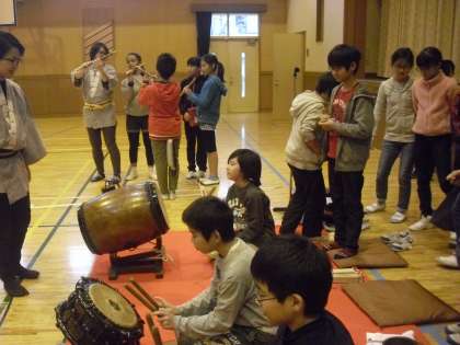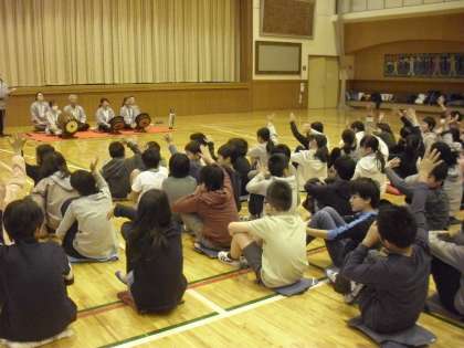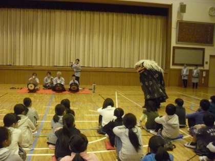 18日。5年生の教科「日本語」の学習で、地域の伝統芸能に親しみました。中町小学校のある一帯は昭和の初期までは、「野良田」と呼ばれていたそうです。江戸時代末期から始まった「野良田囃子」を保存会の方が披露してくださいました。保存会の方は中町小の卒業生や中町に住んでいる方で、天祖神社のお祭りでも「野良田囃子」を披露しています。スペシャルゲスト(獅子舞)も来てくれて大喜びの子どもたち。全員、太鼓や笛、鉦を体験させてもらいました。中町で大切に守られてきた伝統芸能です。次の担い手として、一人でも多くの子どもたちが関わってくれることを願っています。