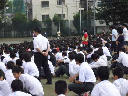 10月8日(金)に玉川中学校、玉川小学校、中町小学校の三校で合同避難訓練を行いました。1000人以上の教職員、生徒、児童が整然と避難できました。また、玉川中学校の生徒会代表より中学校の生徒会活動の紹介がありました。