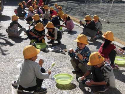 9日。澄み切った青空が気持ちいいです。水は冷たいのですが、日差しは暖かく、絶好のうわばき洗い日和。1年生の子どもたちが、生活科の学習でうわばき洗いに挑戦です。今までは、家の人に洗ってもらっていた子どもも、もう自分で洗えますね。うわばき洗いを通して、自分の持ち物を大切にすること、自己管理できる力を育めたらと思います。また、自分の物に限らず、公共物や資源を大切にする姿勢も育んでいきます。