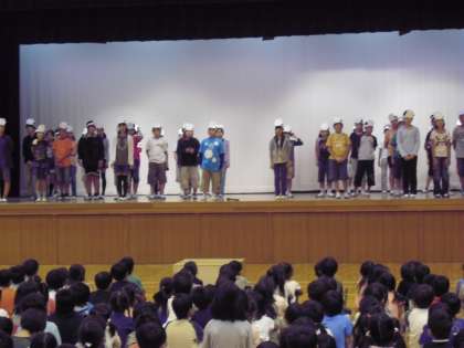 10月18日(月)に児童朝会が行われました。校長先生より先々週に引きつづき「スポーツの勝敗」についての話がありました。10月15日(金)は世界手洗いの日でした。今回保健委員会は財団法人日本ユニセフ協会から、全国200校の世界手洗いサポーターに選ばれ、世界手洗いプロジェクトに参加しました。保健委員会を中心に、朝会で手洗いの大切さを発表し、世界手洗いダンスを踊りました。