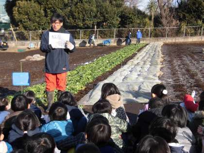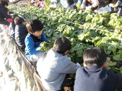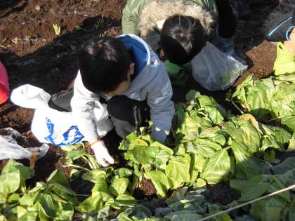 31日。2年生が近所の秋山農園に小松菜採りに行きました。この小松菜は、城南松菜という品種で、大きくてやわらかくておいしい小松菜です。葉がすぐに痛んでしまうため、市場には出回りません。貴重な小松菜のお土産にニコニコの子どもたちです。