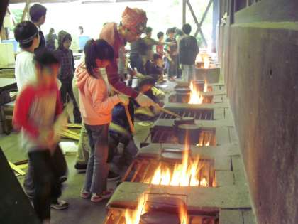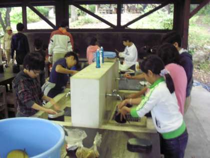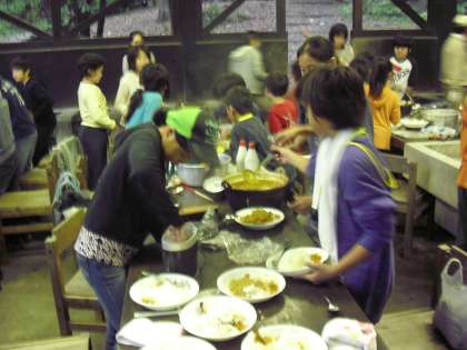 一日目の大イベント「飯ごう炊飯」です。かまど係、飯ごう係、カレー係に分かれ、協力して夕飯を作りました。食事を自分たちで作る楽しさと難しさを実感しました。