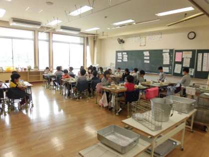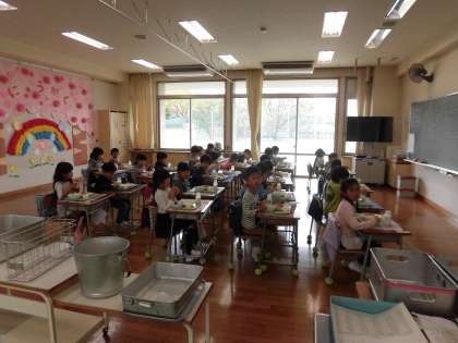 11日。今日から1年生の給食が始まりました。上学年の子どもたちと同じメニューですが、自分たちで準備をし、配膳することができました。お行儀よく給食のルールやマナーを守って楽しく食べていました。中町小学校の給食はとてもおいしいので、明日からも楽しみです。