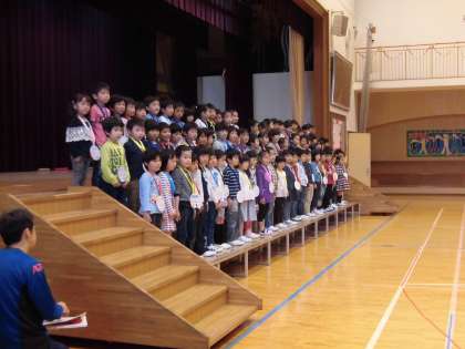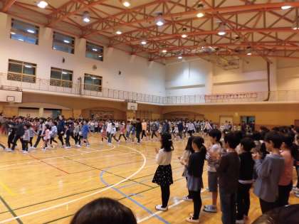 14日。6年生といっしょにかわいい1年生が入場し、1年生を迎える。全校児童が体育館に集まり、ようやく501人全員がそろいました。歓迎のセレモニーの後、全校児童でゲームを楽しみました。6年生は、今週、1年生の朝の支度やお世話をしてくれました。本当に頼りになる最高学年です。来週も来るのが楽しみな中町小学校です。