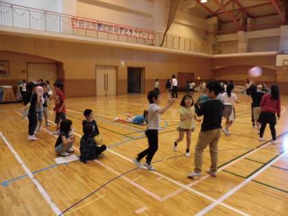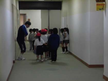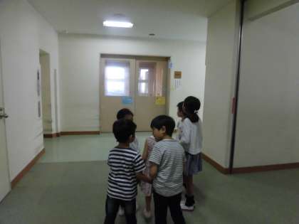 20日。何やら楽しそうな1年生と真剣な表情の2年生がペアになって学校の中を案内しています。ふだんは入れない校長室、職員室にも特別で入れてもらいました。屋上にあるプールと調理中の給食室には入れないので、ドア越しで見学です。たんけんを待っている間もなかよく体育館で遊びました。同じ1階の教室でこれからも協力しあって生活していきます。
