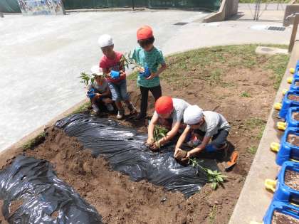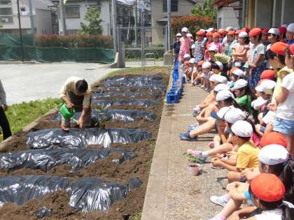 2年生の子どもたちが世田谷ファームの方から苗植えのコツを教えていただいて、夏野菜の苗を植えました。これから水やりのお世話をがんばります。自分で育てたオクラ、ピーマン、シシトウ、トマト、ナス、キュウリはきっとおいしいことでしょう。