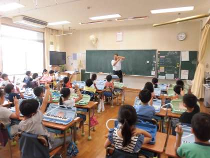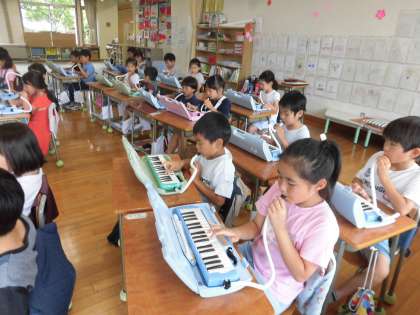 6日。1年生が楽しみにしていたけんばんハーモニカの出前授業が行われました。右手の人差指(2番)と中指(3番)を使うだけで、「たこたこあがれ」のメロディが演奏できました。けんばんハーモニカの学習の約束をきちんと守って、楽しい音楽の授業になりました。